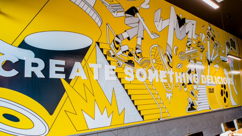 The foundation was a custom signage program that balances consistency with flexibility — each store receives signage tailored to its physical space while aligning to brand standards. Community-focused wall murals give each location its own identity without breaking from the whole.